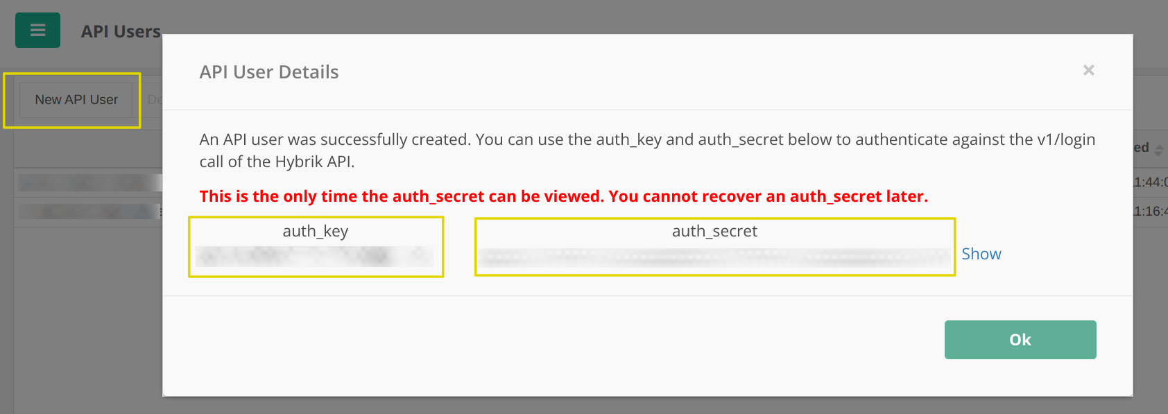 API User key and secret