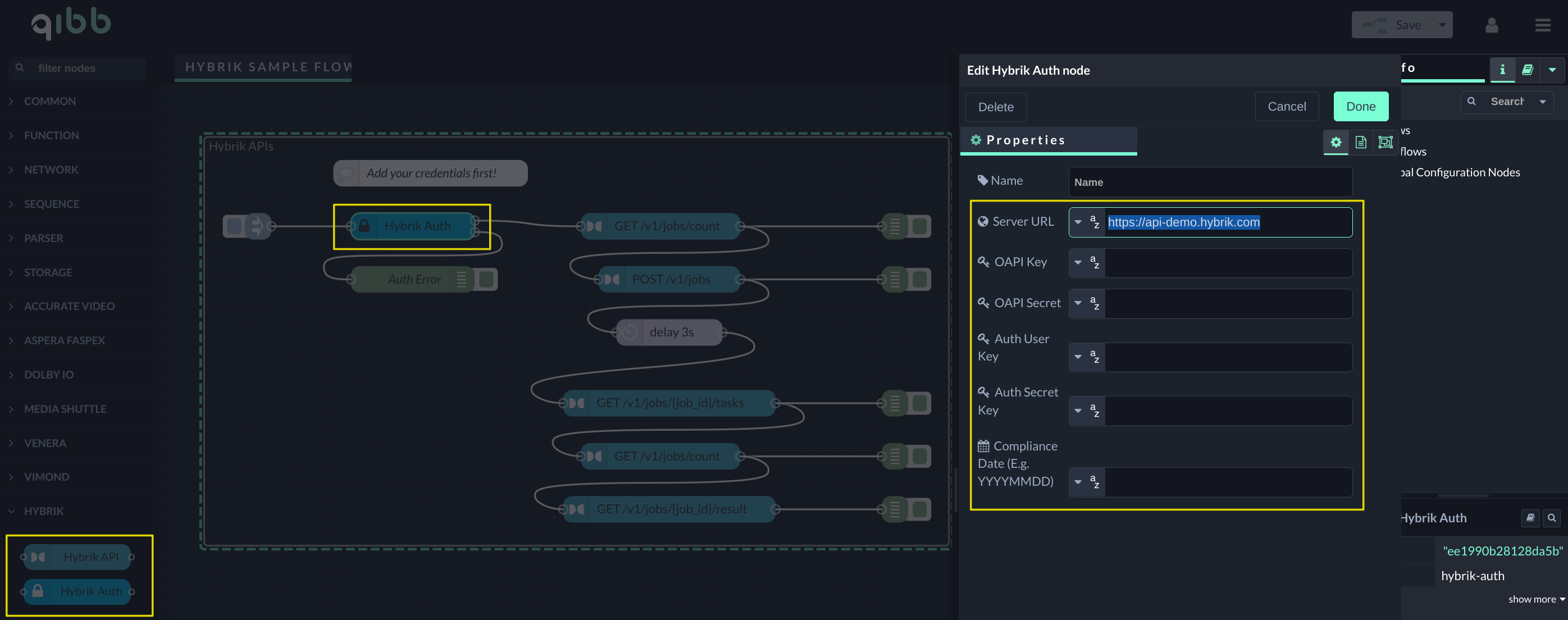 Drag the Hybrik Auth API node, and set up the Server URL and authentication credentials.