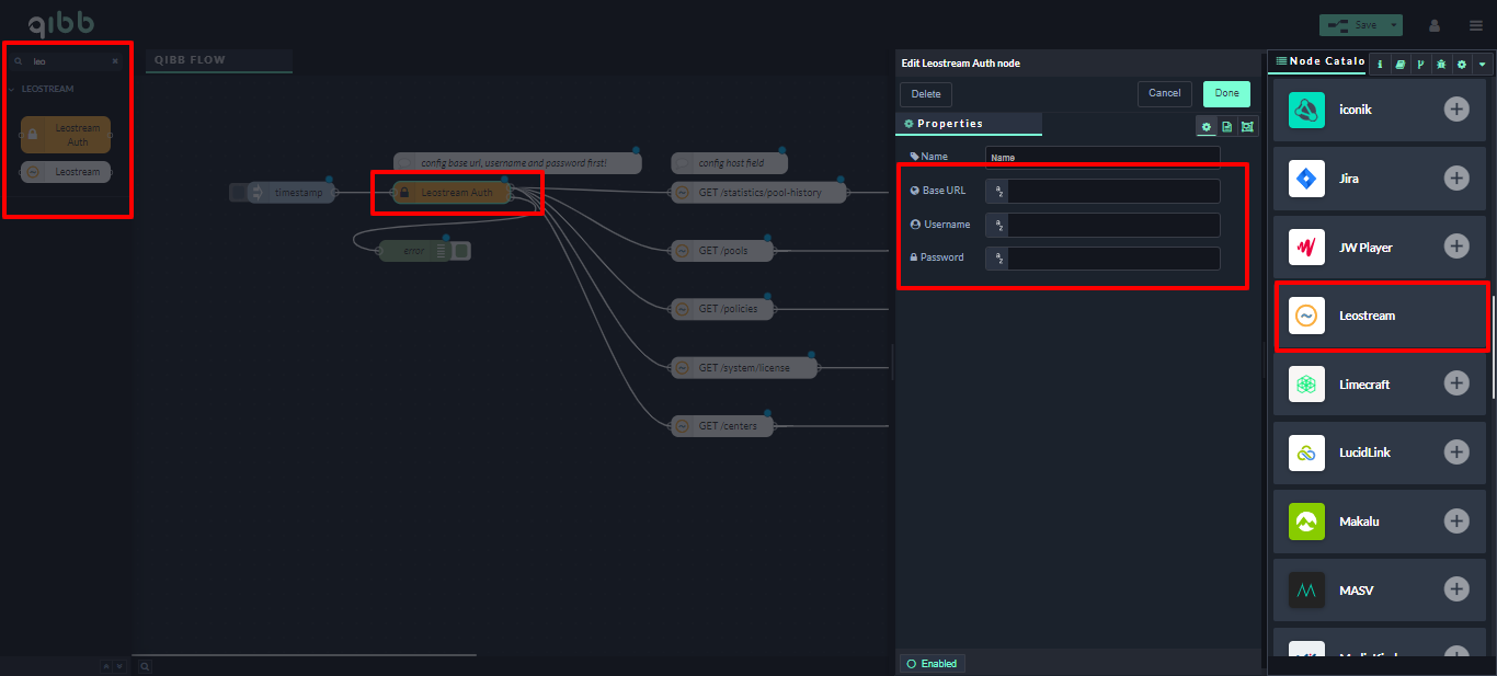 3. Configuration: Drag and drop the Leostream Auth and Leostream nodes from the left sidebar to your flow and connect them. Enter your Base URL, Username, and Password credentials to the respective fields.
