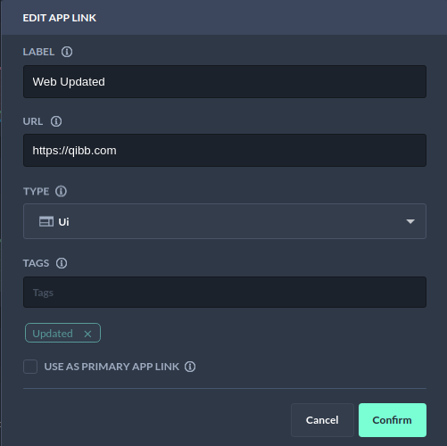 Clicking on the edit icon will open up a model and includes information about the label, URL, type, and tags. It also has a checkbox button to make it a primary app link.