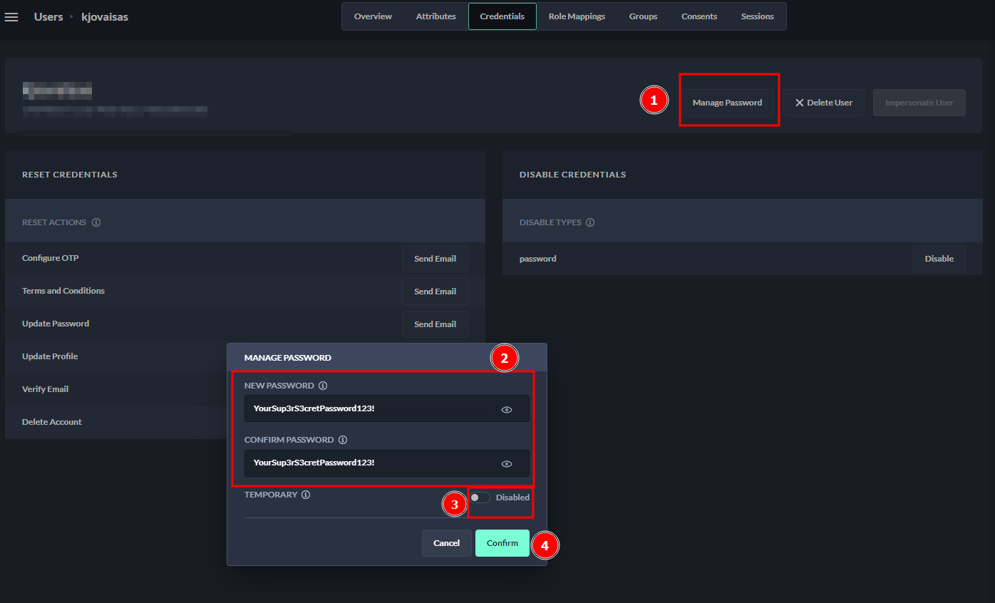 If a temporary password is to be assigned, enable the corresponding button below the password fields. A temporary password is valid only until the user logs in again, after which the user will be prompted to change the password.For demonstration purposes, a permanent password has been set at this point. Make sure the Temporary Password button is set to Disabled. Enter your new password and press Confirm. Make sure that the passwords in both fields match.