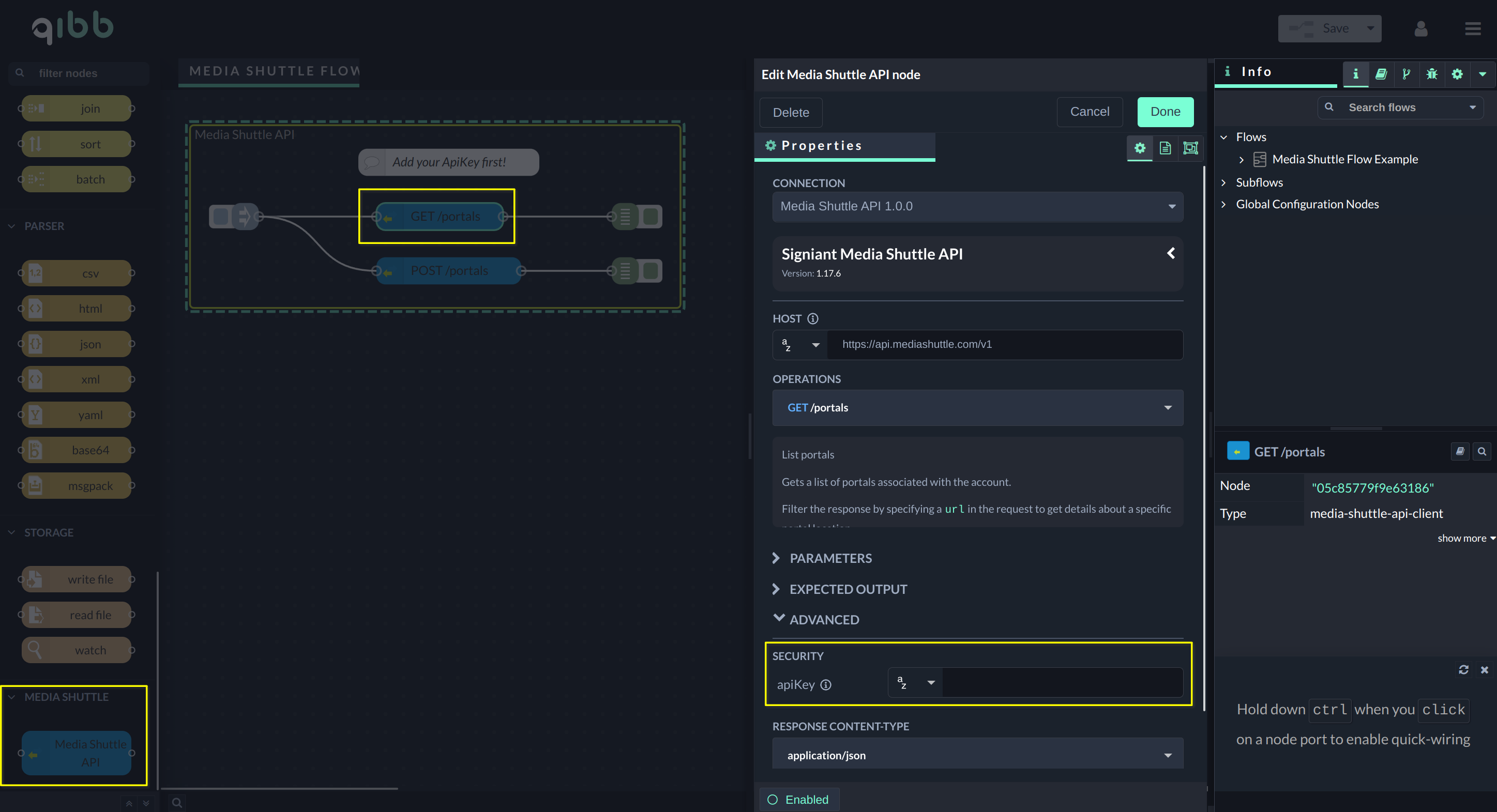 Open the Media Shuttle node, enter your API Key under Advanced/Security, select an operation and you can start using the integration!