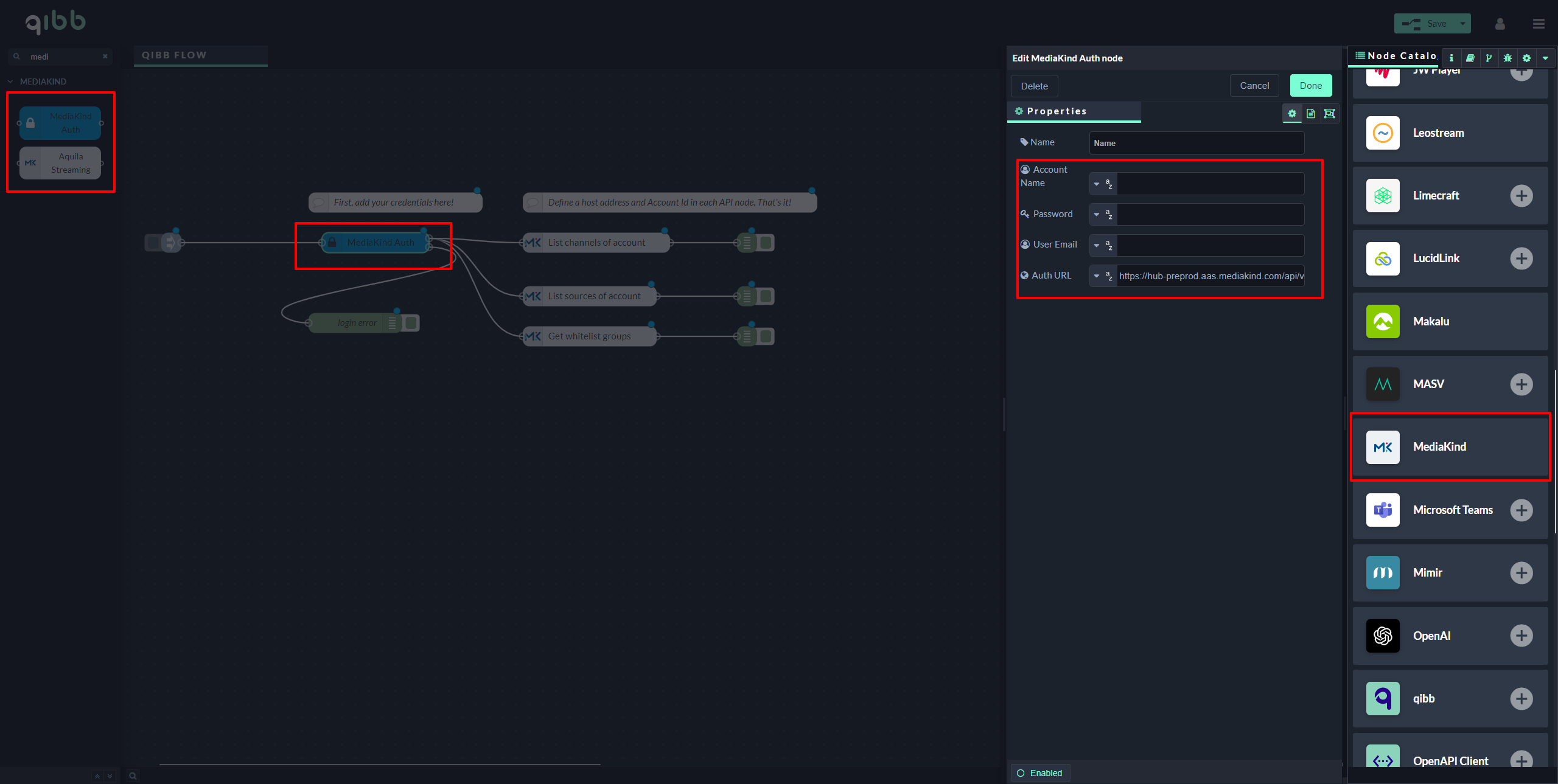 Node installation: In the qibb Workflow Editor, open the qibb Node Catalog in the right sidebar and install the MediaKind node by clicking on the "+" button.