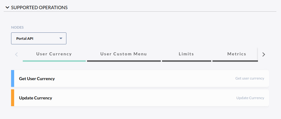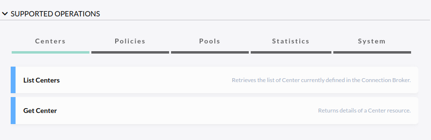 The supported operations section lists the Open API operations in tabs view with a possibility to expand and collapse the supported operations section.
