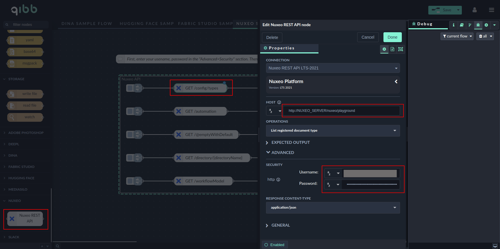 Open the Nuxeo node. Select an operation, enter your token and parameters as required, and you can start using the integration!