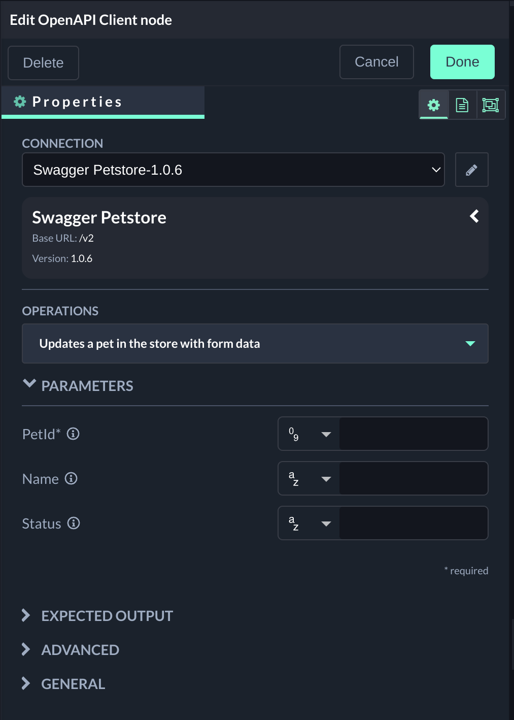 If there are parameters defined for the selected operation, a Parameters section will be displayed. There are different types of input parameters. All of them can be either provided in their input fields or injected through the previous Node (more information in Node Ports). Some parameters are required. They are marked by an asterisk (*). All parameters except the body-parameter use the reference dropdown (more information Reference Dropdown)