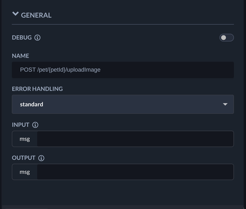 The Node has one input and, based on the Error Handling setting, one or two output ports. The following section lists the parameters you can define for the input msg object, and the ones you can expect at the output. Input parameters in the msg object will always overwrite the values directly defined in the Node.