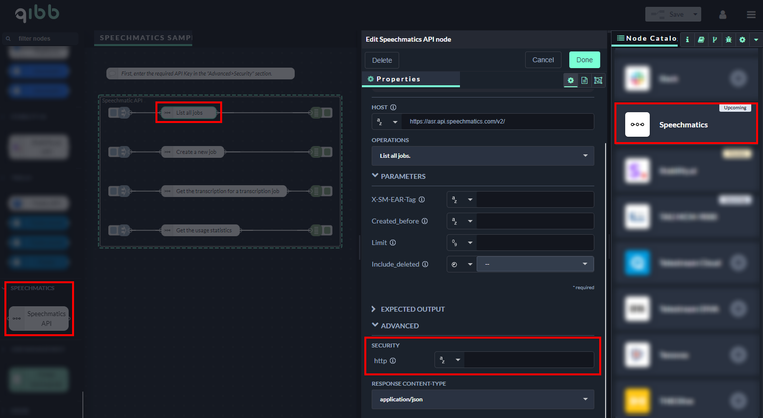 Go to qibb Workflow Editor, open Node Catalog in the right sidebar, and install Speechmatics node by clicking on the + button.