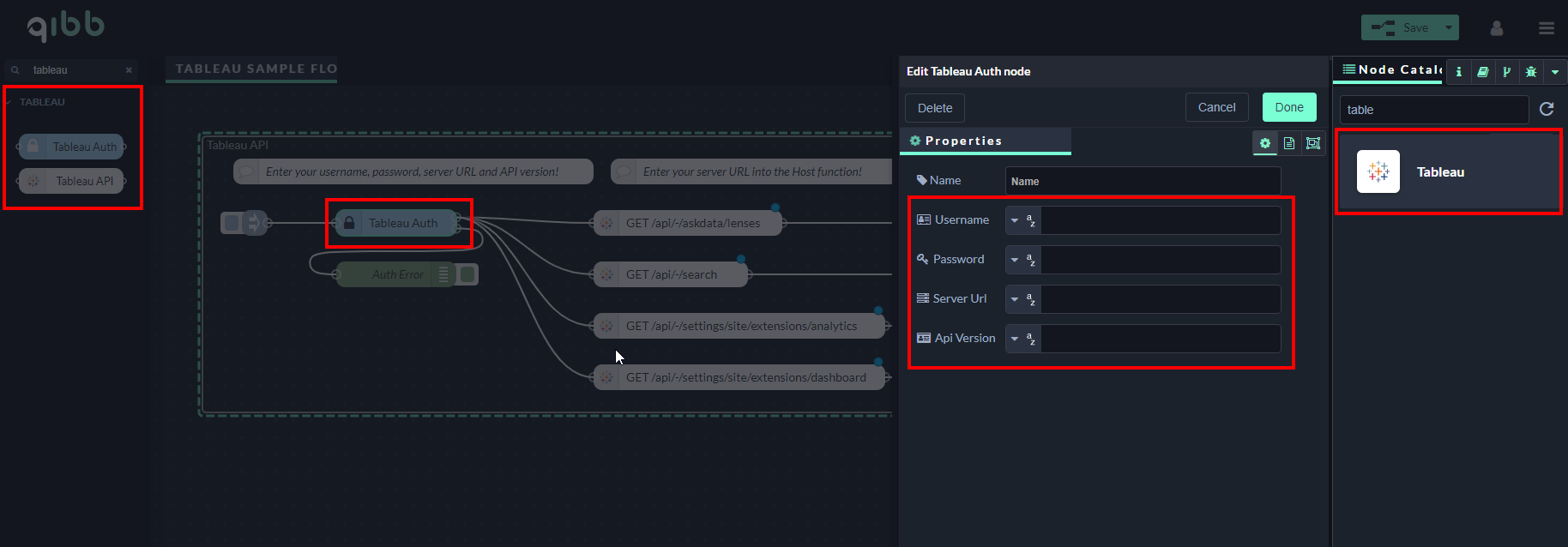 Go to qibb Workflow Editor, open Node Catalog in the right sidebar, and install Tableau node by clicking on the + button.