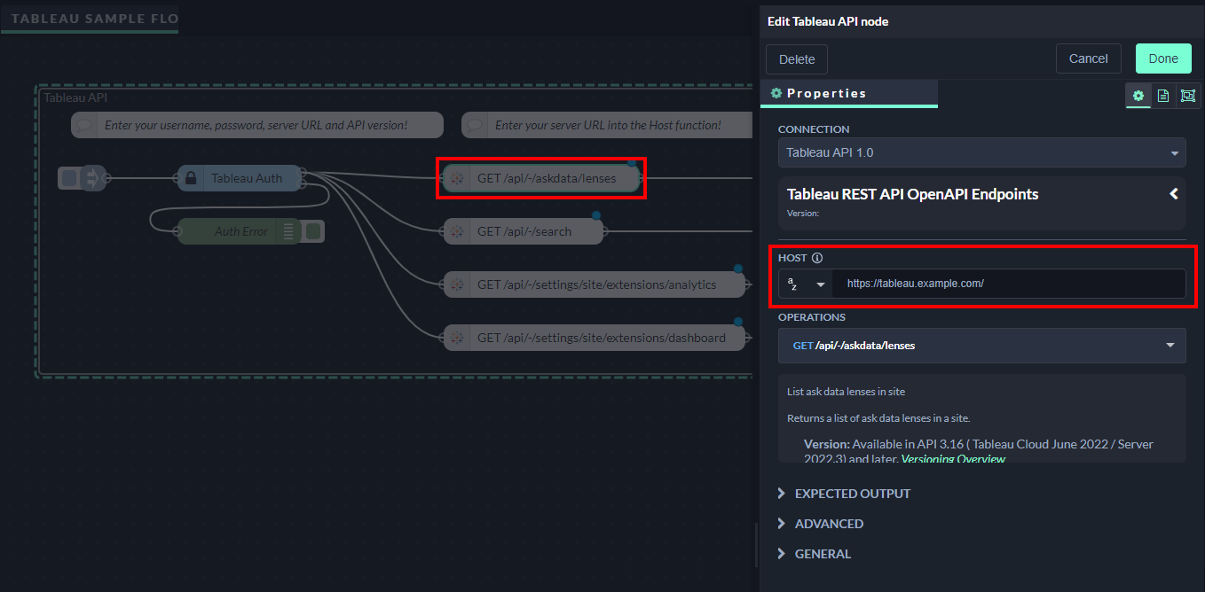 Enter your credentials into the Username, Password, Server URL and API Version fields of the Tableau Auth node, then your Server URL into the Host field of the Tableau API node and start using the integration!