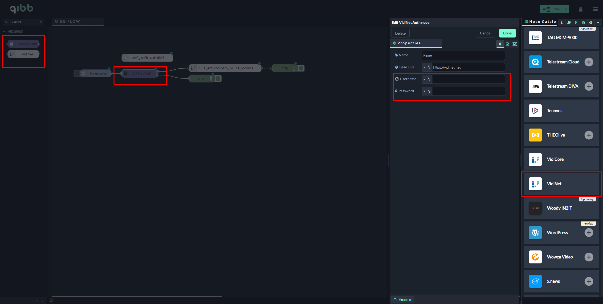 Enter your credentials to the Username and Password fields of VidiNet Auth node.