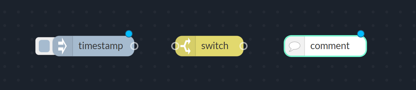 Nodes are defined by their input on the left side and their output on the right side of the node. There are three different options for each in- and output of a node. Either there is no input or output, or there is a port, marked as a gray circle, where other nodes can be connected at. Some nodes have an attached button, which allows manual control of different options. The figure below shows three examples for different node types. The timestamp node has a button instead of an input node to manually trigger a flow with a passed on timestamp. The switch node has an input and output port, and the comment node doesn't have any input or output options.