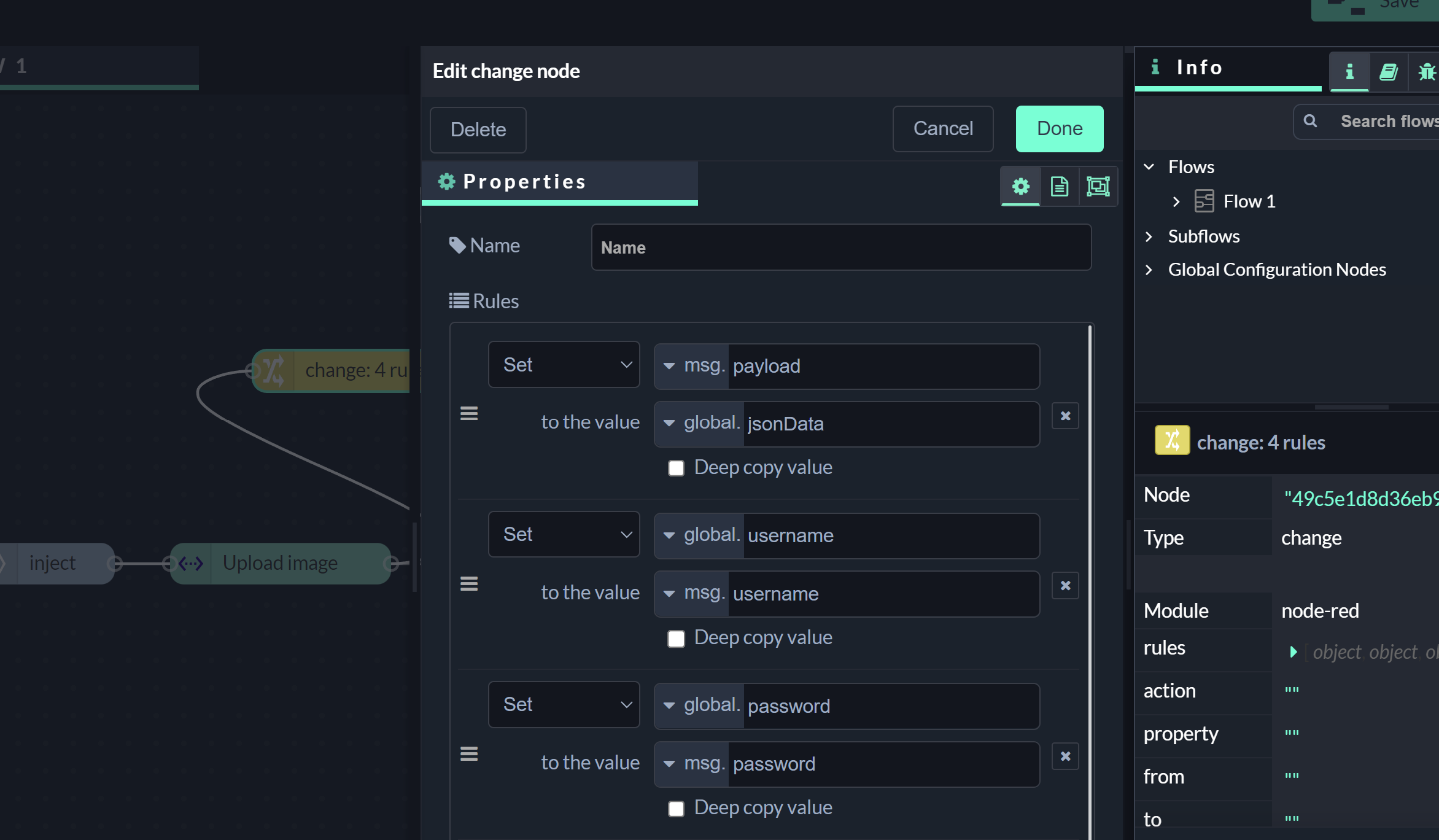 Every flow consists of multiple nodes which are connected to build an application. Each node fulfills a specific task and has its configuration options.
